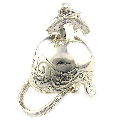Fine craftsman made Sterling Silver large charm made in the UK. Roman Centurion's helmet with moving swing chin strap. Free extra silver split ring with every charm for easy home fitting. These are the same type and size as supplied with Links of London charms and bracelets. Supplied in vinyl pouch. Also suitable as a pendant. This item can be supplied with a lobster trigger catch as an alternative fitting to the rings. If you would like this please let us know immediately on purchase.