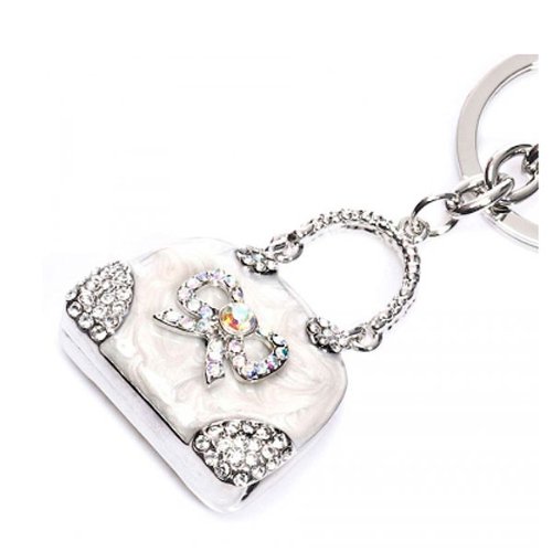 Lovely white pearlescent enamel and diamante handbag charm - with little crystal \'bow\' detail in silvertone finish. A beautiful piece to add a bit of glam to your handbag. Approximately 4cm width - lovely chunky charm. Complete with keyring. Comes in lovely little gift pouch. Great gift idea!